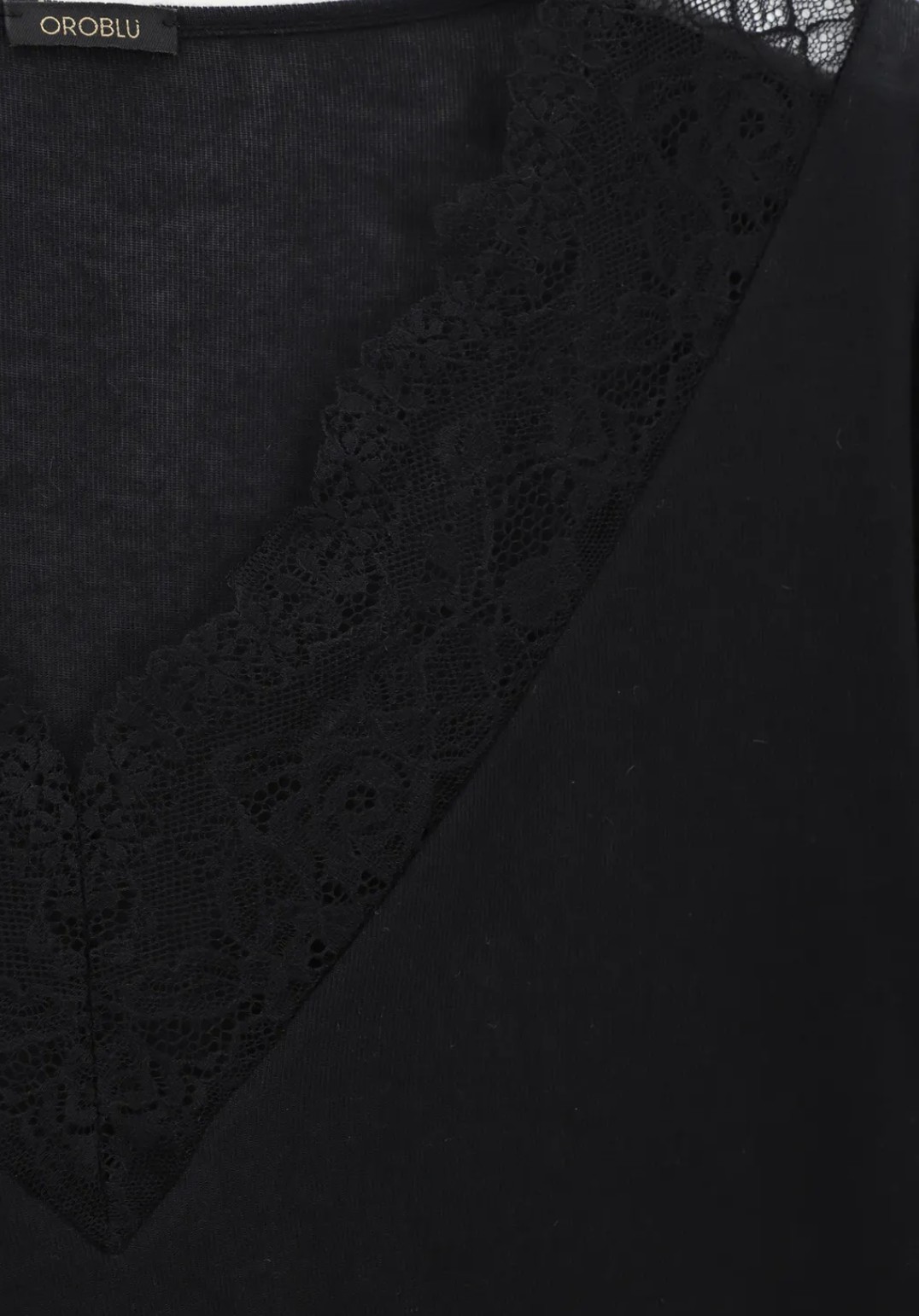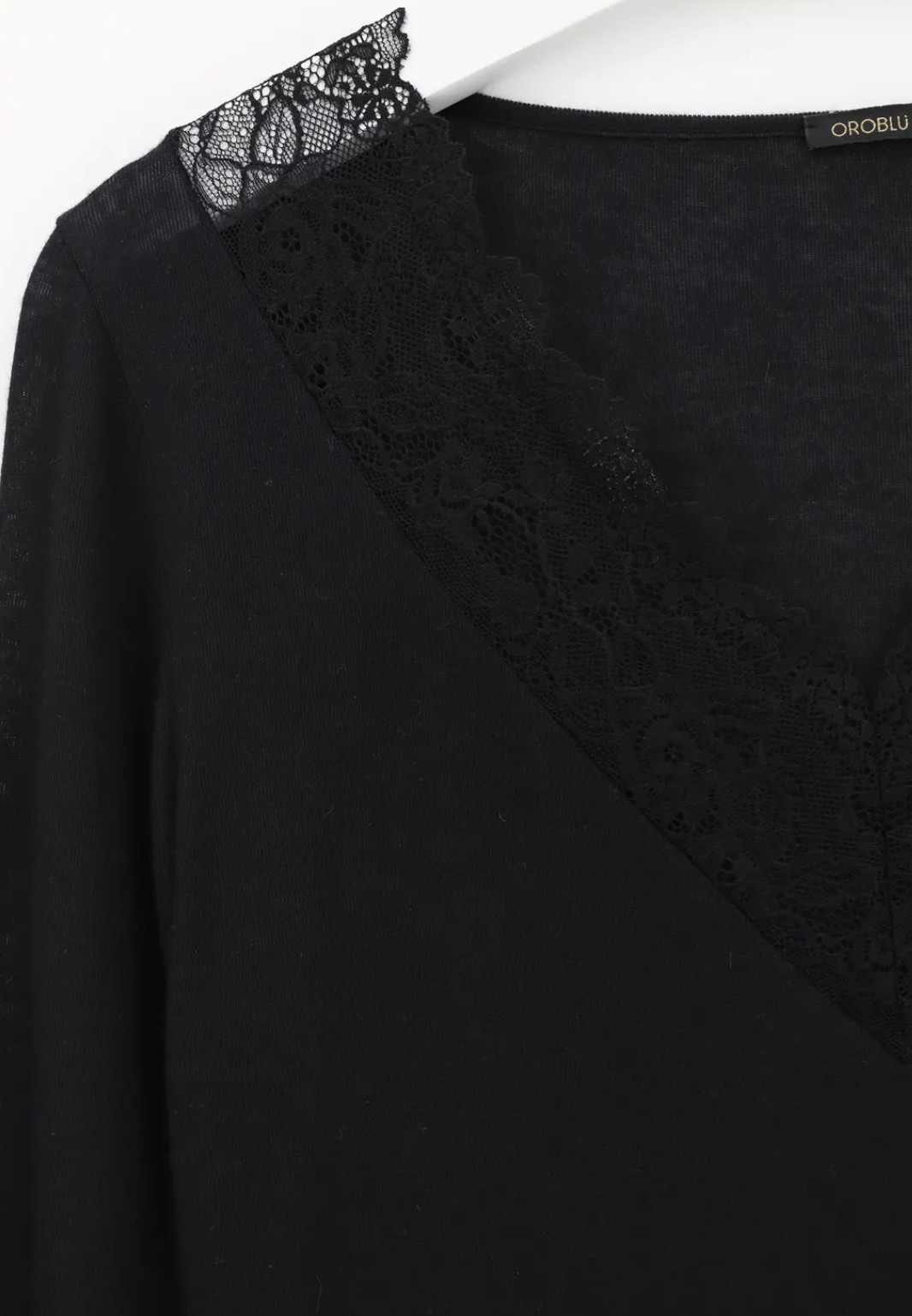 This top has an elegant and refined appearance, fitting harmoniously to your silhouette. Its V-neck embellished with delicate lace adds a touch of femininity and sophistication, perfect for special occasions or to add a touch of class to your daily routine.